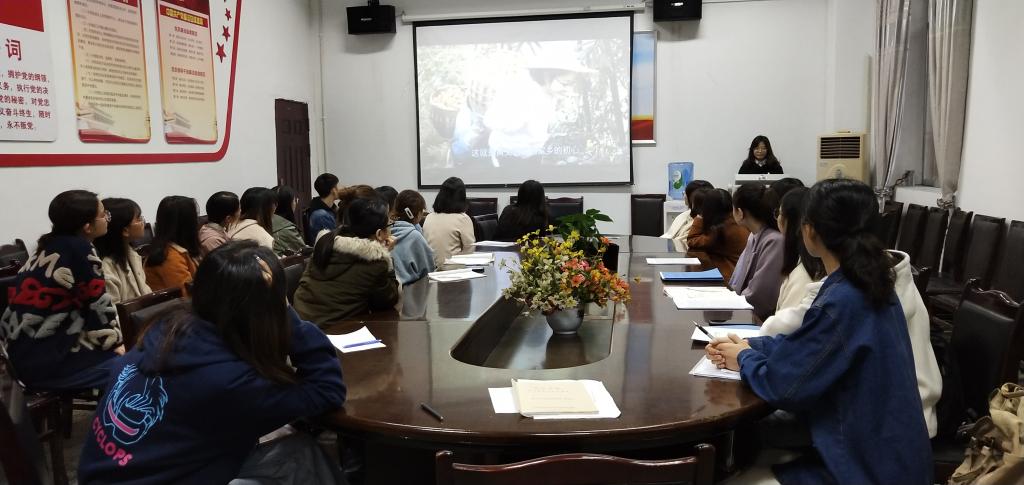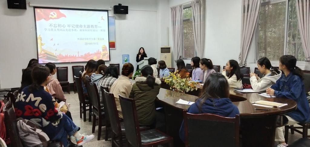 为深入学习习近平新时代中国特色社会主义思想,进一步扎实开展“不忘初心、牢记使命”主题教育,2019年11月8日上午,外国语学院学生第二党支部于外国语学院会议室召开了“学习黄文秀先进事迹, 谈如何站好最后一班岗”主题党日活动。会议由支部书记魏春梅主持。