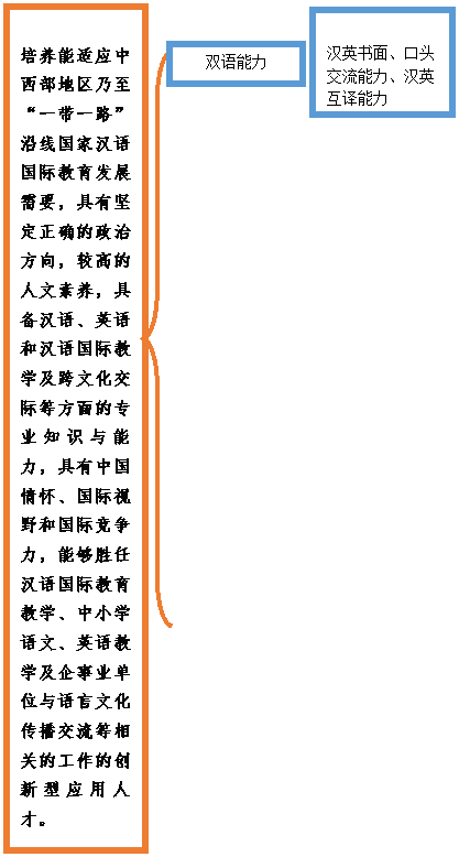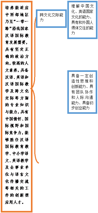 培养能适应中西部地区乃至“一带一路”沿线国家汉语国际教育发展需要,具有坚定正确的政治方向,较高的人文素养,具备汉语、英语和汉语国际教学及跨文化交际等方面的专业知识与能力,具有中国情怀、国际视野和国际竞争力,能够胜任汉语国际教育教学、中小学语文、英语教学及企事业单位与语言文化传播交流等相关的工作的创新型应用人才。